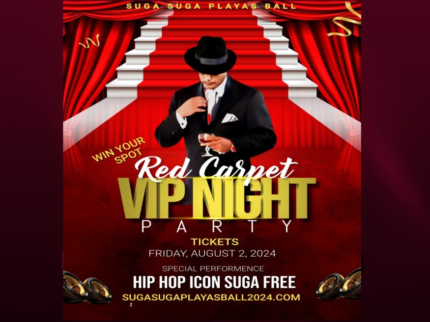 "Why dont you secure your spot on the red carpet on the Suga Suga Playas Ball VIP night with (2) VIP party tickets with hip-hop icon Suga Free, it's your chance to win two VIP tickets for your special spot on the red carpet with the legendary artist. Simply share why you admire Suga Free and why you believe you deserve a spot alongside him on the red carpet. For more information, visit SugarSugarPlayBall2024.com or send it to sugasugaplayasball2024@gmail.com or call (877)499-4999
