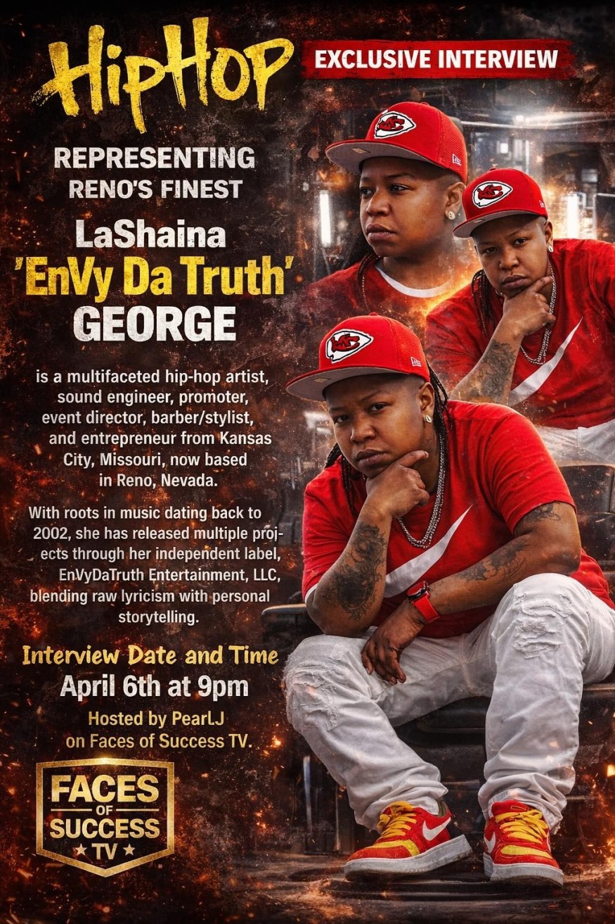 LaShaina “EnVy Da Truth” George is a multifaceted hip-hop artist, sound engineer, promoter, event director, barber/stylist, and entrepreneur from Kansas City, Missouri, now based in Reno, Nevada. With roots in music dating back to 2002, she has released multiple projects through her independent label, EnVyDaTruth Entertainment, LLC, blending raw lyricism with personal storytelling. Her latest single, “SNAP BACK,” dropped on September 2, 2025, delivering 2 minutes and 18 seconds of unfiltered resilience and growth, reflecting her journey from challenges to triumph—no features, just pure authenticity. The track’s official music video, released in February 2026, amplifies her message of snapping back stronger, solidifying her as a force in independent rap.